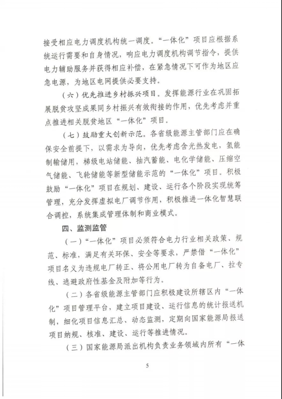 “一體化”項目接受相應(yīng)電力調(diào)度機構(gòu)統(tǒng)一調(diào)度。“一體化”項目應(yīng)根據(jù)系統(tǒng)運行需要和自身情況,響應(yīng)電力調(diào)度機構(gòu)調(diào)節(jié)指令,提供電力輔助服務(wù)并獲得相應(yīng)補償,在緊急情況下可作為地區(qū)應(yīng)急電源,為地區(qū)電網(wǎng)提供必要支持。原文見下: