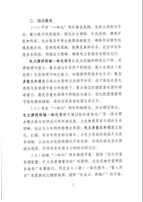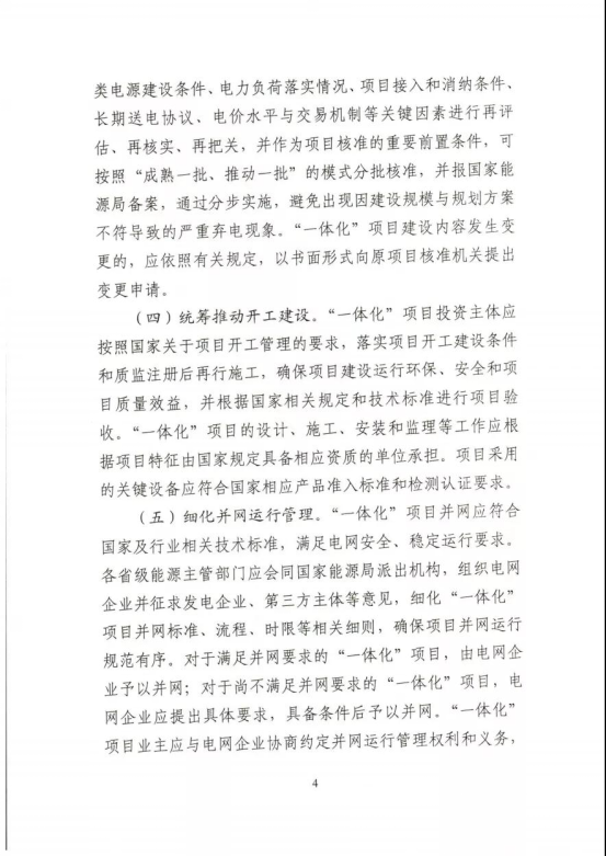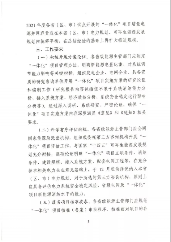 工作要求:積極開展方案論證。科學(xué)有序評估納規(guī)。落實項目核準要求。統(tǒng)籌推動開工建設(shè)。細化并網(wǎng)運行管理。優(yōu)先推進鄉(xiāng)村振興項目。鼓勵重大創(chuàng)新示范。在上述工作要求中,《通知》要求,各省級能源主管部門應(yīng)開展“一體化”項目評估工作,與國家“十四五”可再生能源發(fā)展規(guī)劃充分銜接,逐項論證明確“一體化”項目立項條件、消納條件、建設(shè)規(guī)模、接入系統(tǒng)方案、配套電網(wǎng)工程等,在充分征求相關(guān)電力企業(yè)意見基礎(chǔ)上,于12月底前擇優(yōu)納入本省(區(qū)、市)電力規(guī)劃。