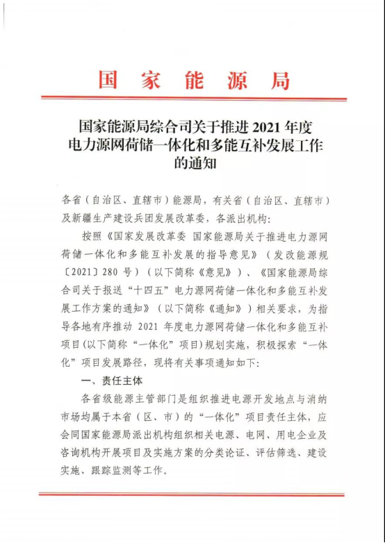 11月10日,國家能源局發(fā)布《關(guān)于推進2021年度電力源網(wǎng)荷儲一體化和多能互補發(fā)展工作的通知》。