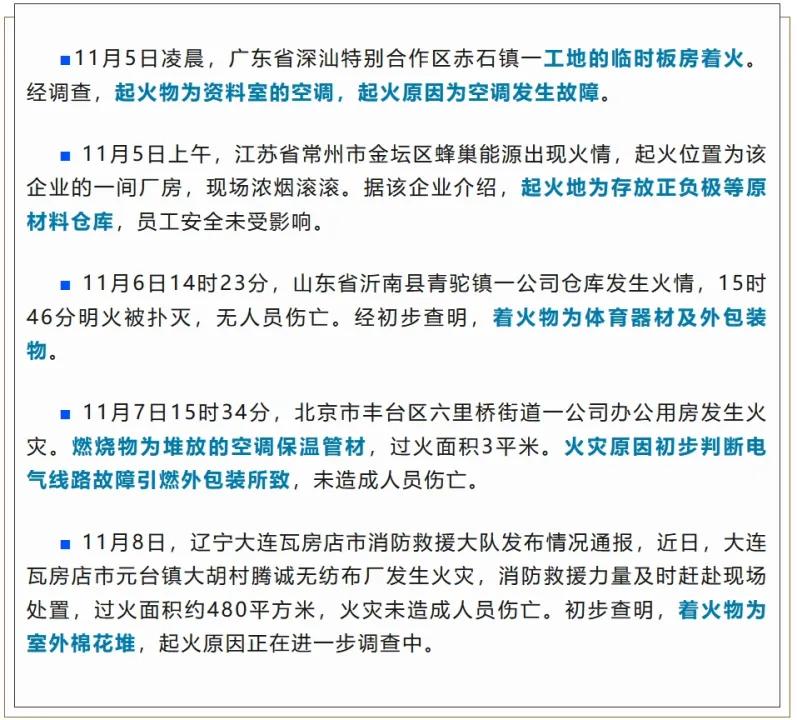 隨著冬日到來,氣候寒冷、干燥、多風,傳統(tǒng)節(jié)日、大型活動集中,用火用電用氣量增加,火災呈現(xiàn)易發(fā)多發(fā)之勢。根據(jù)有關(guān)火災數(shù)據(jù)統(tǒng)計,一年中冬季火災起數(shù)占比最大,特別是第四季度生產(chǎn)、經(jīng)營、建設活動頻繁,火災形勢嚴峻復雜。進入11月以來,多地建筑工地、工廠倉庫等生產(chǎn)經(jīng)營場所接連發(fā)生火災,值得高度警惕!