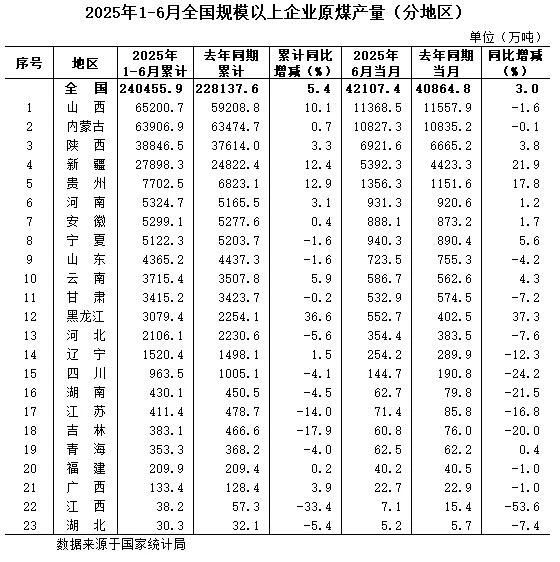 1月—6月全國規模以上分省區原煤產量數據發布